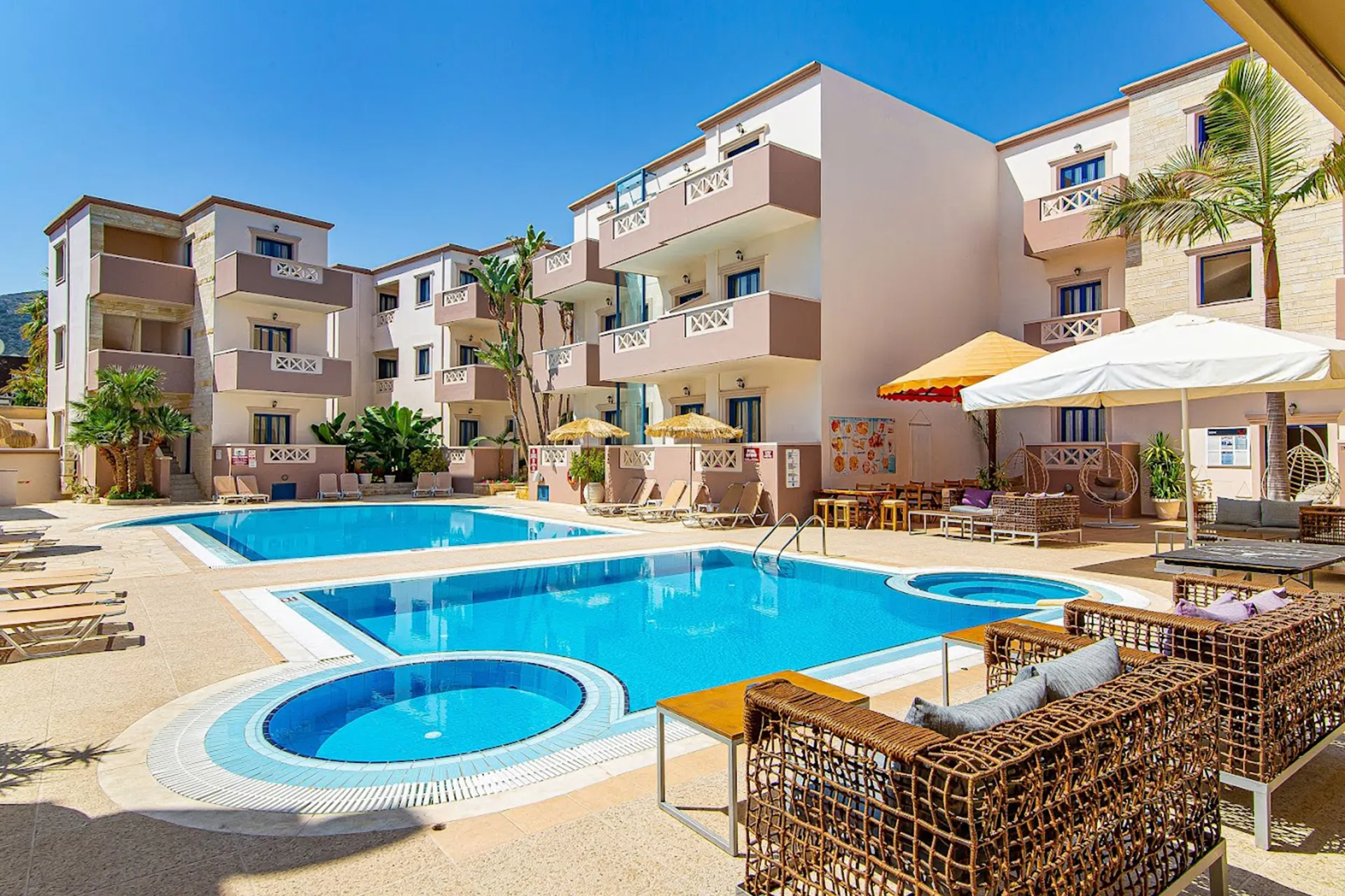 Appartement is basic ingericht maar schoon, fijn zwembad, ligbedden aanwezig, vriendelijk personeel. Met de geweldige temperaturen en volop betaalbare eetgelegenheden, supermarkt op loopafstand is dit prima. Als je aan de straatkant zit kan je genieten van het bruisende leven. Wel s nachts tot 5 uur veel mensen, veel verkeer op straat met soms het nodige lawaai. In september minder feestende jongeren. Op basis van logies prima. Ontbijt is zeer eenvoudig.
