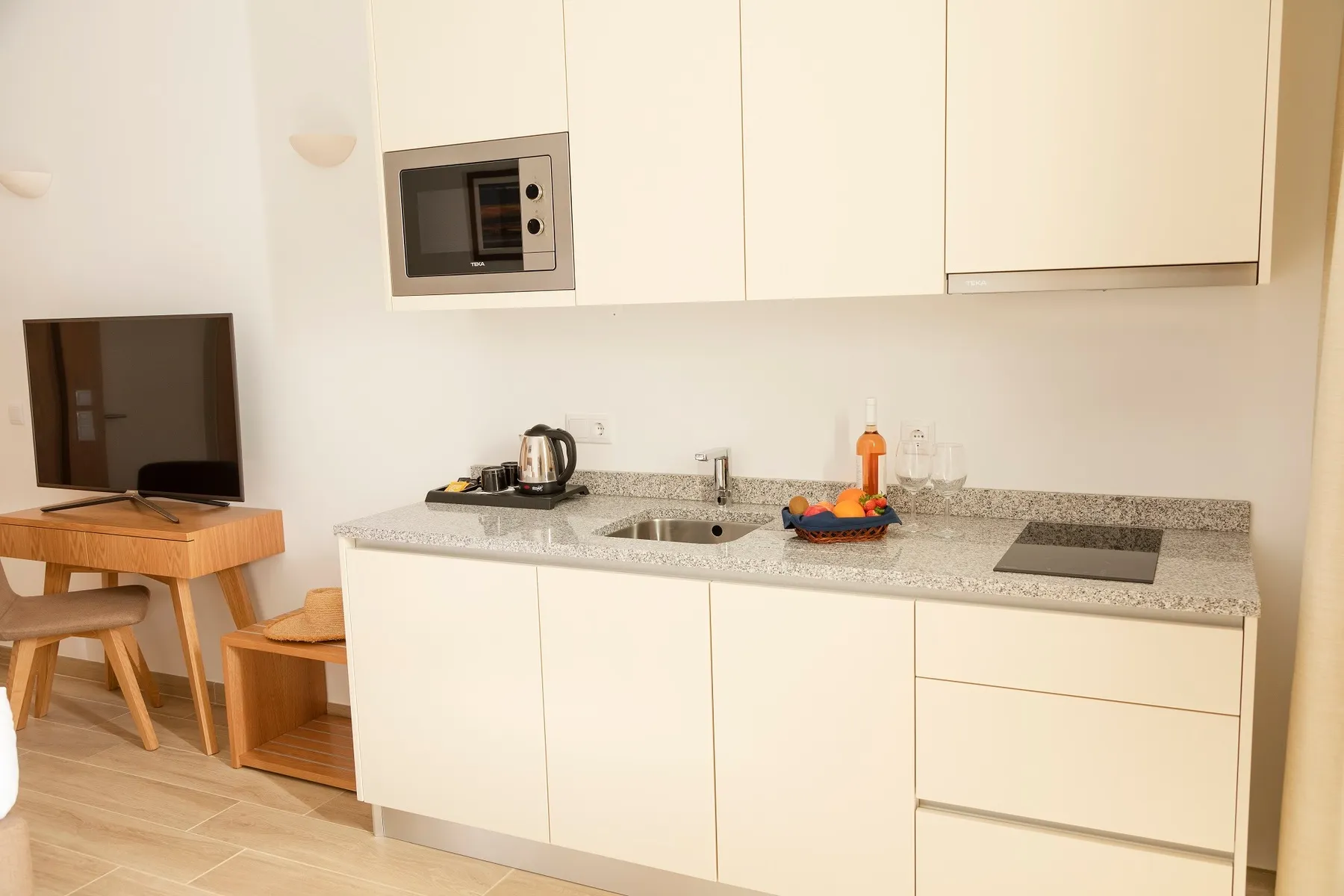 In de kamers zijn airconditioning en verwarming voorhanden. De gasten kunnen vanaf het balkon of het terras van het uitzicht op de tuin genieten. De kamers beschikken over een tweepersoonsbed, een queensize bed of een kingsize bed. Extra bedden kunnen worden aangevraagd. Bovendien zijn een kluis en een bureau beschikbaar. Een kitchenette met een koelkast, een magnetron en een thee-/koffiezetapparaat is eveneens standaard aanwezig. Bovendien zijn een telefoon, een televisie en Wi-Fi (kosteloos) beschikbaar. In de badkamer – uitgerust met een douche – vinden de gasten een föhn. Het hotel beschikt over gezinskamers en niet-rokerskamers.